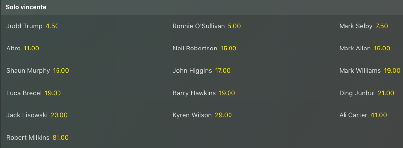 Più staccati in seconda fascia troviamo Neil Robertson, Mark Allen e Shaun Murphy, tutti con la stessa quota @15, poi troviamo John Higgins @17 a fare da sparti acque con un trio di giocatori @19 volte la posta: Mark Williams, Barry Hawkins e il campione del mondo Luca Brecel, un pò snobbato dalle lavagne dei bookmakers.