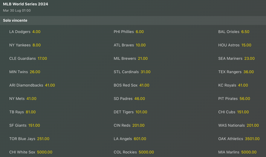 Come anticipato gli LA Dodgers sono i favoriti nelle lavagne delle quote antepost per la vittoria finale delle World Series di MLB, ma questa non è una novità visto che LAD è da mesi al vertice per i bookmakers, con i Philadelphia Phillies che rimangono la prima alternativa, tallonati da Baltimore Orioles e NY Yankees che anche qui se la giocano quasi alla pari. Con gli Atlanta Braves si sale in doppia cifra, ma stanno tornando a farsi sentire anche qui gli Houston Astros che si mettono alle spalle i Cleveland Guardians.