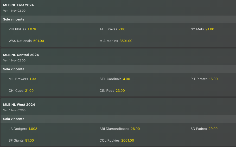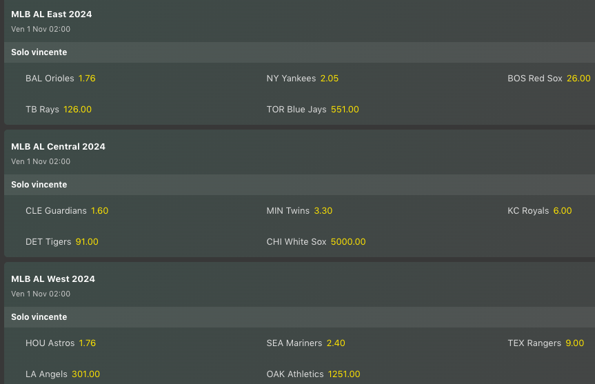 Houston protagonista anche nelle quote di una delle division più interessanti, la AL West. Come abbiamo detto Houston ha ripreso la testa della division, ma Seattle è ancora li, e se riuscisse a migliorare l’attacco potrebbe dire la sua, oltre a non poter ancora togliere dai giochi i Texas Rangers, nonostante questi abbiano una quota molto alta rispetto alle prime due della classe. Da notare come tutte le division di American League siano abbastanza combattute anche nelle quote, mentre quelle di National League sembrano già tutte scritte, ma sarà davvero così? La stagione è ancora lunga, e per esempio in NL Central non è detto che Milwaukee non troverà pane per i suoi denti.