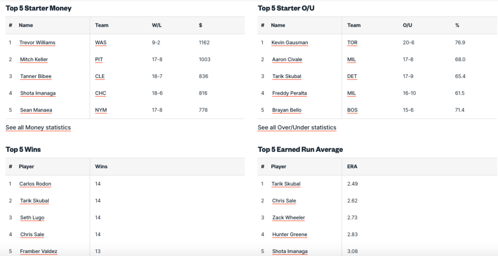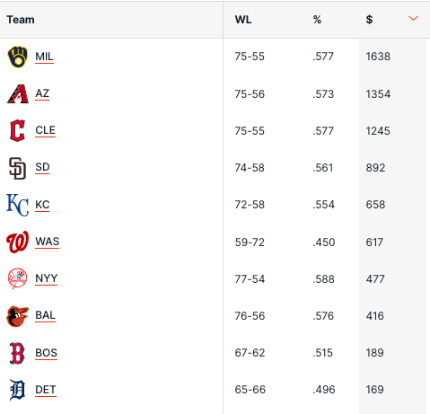 I Milwaukee Brewers rimangono la miglior squadra come rendimento nelle scommesse con +16.38 unità di profitto. Al 2° posto salgono anche qui gli Arizona Diamondbacks (+13.54) poi ci sono i Cleveland Guardians (+12.45) a completare il podio e ultima squadra in doppia cifra di resa visto che poi si passa ai San Diego Padres a +8.92 unità in 4° posizione.