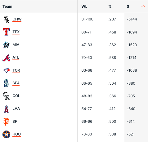 La peggior squadra su cui puntare è sempre, nettamente, quella dei Chicago White Sox con un disastroso -51.44 unità che parla da solo visto che in questa statistica al 2° posto ora ci sono i Texas Rangers ma con “solo” -16.94, poi abbiamo i Miami Marlins a -15.23.