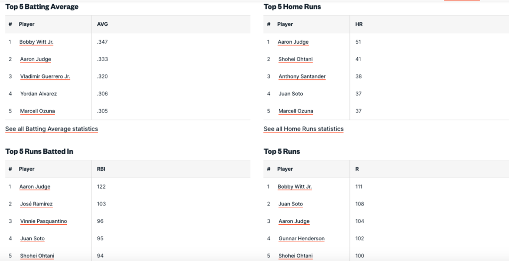 Vediamo anche le top-5 delle principali statistiche di pitcher e giocatori d’attacco.