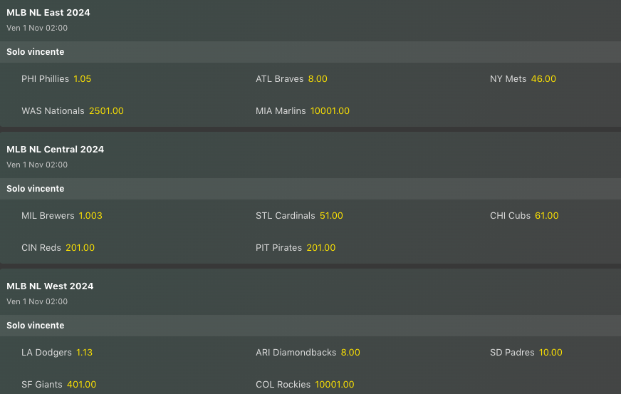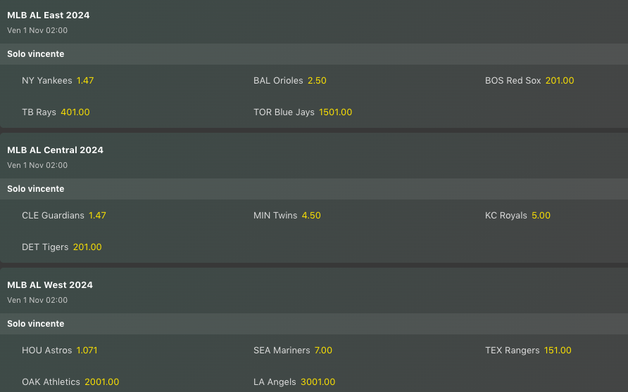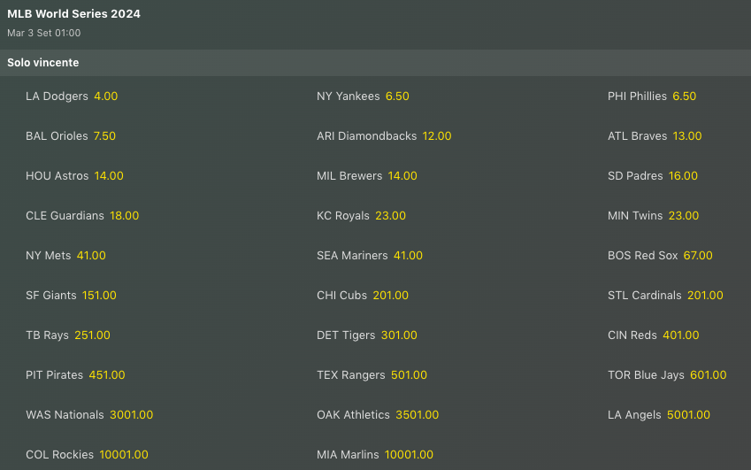 Ecco gli aggiornamenti delle principali quote antepost, ad iniziare dalla lavagna per la vittoria finale delle World Series 2024 dove gli LA Dodgers non mollano il primo posto, ma i NY Yankees hanno agganciato i Philadelphia Phillies e superato anche qui in quota i rivali di Baltimore.