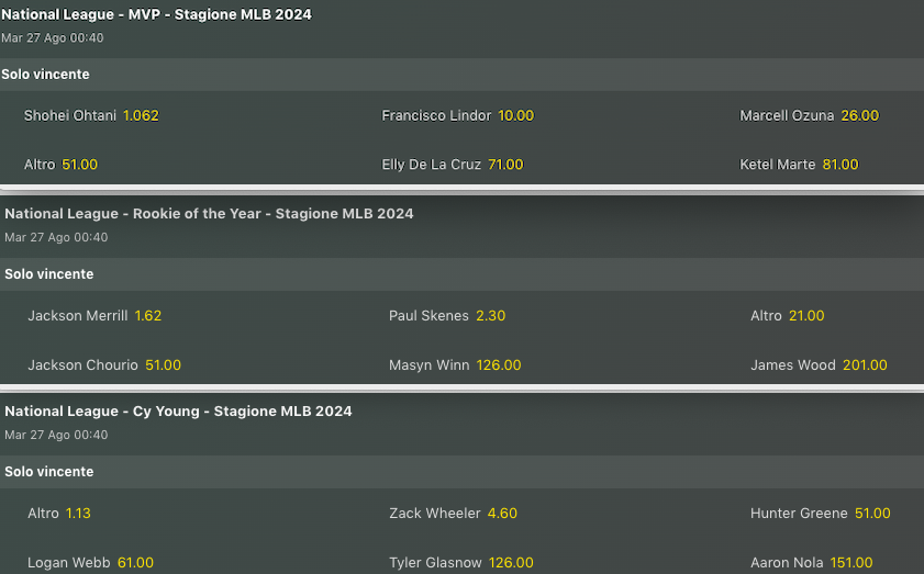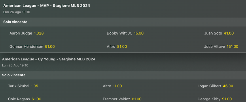 Fino anche solo ad un mesto fa la cosa sembrava impensabile, col pitcher dei Pirates che si giocava appena @1.02 per la vittoria di questo titolo, dopo aver abbattuto diversi record a suon di prestazioni impressionanti, e dopo aver avuto anche il raro onore (per un rookie ancor di più) di aprire la partita delle stelle come starter della National League all’All Star Game. Skenes sta continuando ad offrire un grande rendimento (8-2, 2.16 ERA, 0.94 WHIP con 130 strikeouts in 104 innings), suo malgrado nella difficile situazione generale che sta attraversando Pittsburgh; ma i numeri di Merrill iniziano ad essere davvero importanti (.288/.319/.488 con 19 home runs e 13 basi rubate).