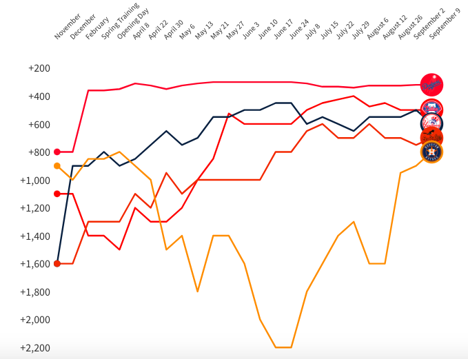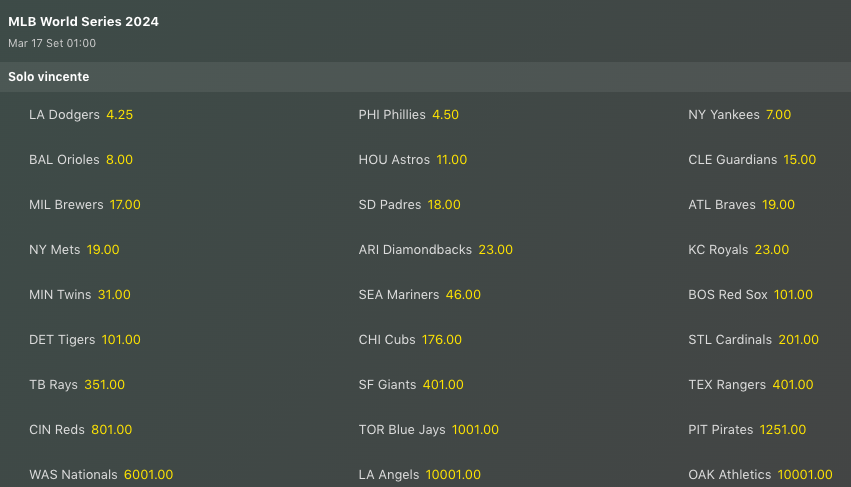 In questo veloce video shorts Guru guarda e commenta le stime in % per la vittoria finale delle World Series, con tre squadre favorite sulle altre: Dodgers (ok), Phillies (ok) e Guardians (più dubbi) tutte col 12% di chance, di poco avanti sugli Yankees al 11%. Crescono anche le chance degli Astros che ora troviamo al 7%, e come vediamo anche qui sotto, pure le quote di Houston hanno fatto le montagne russe.