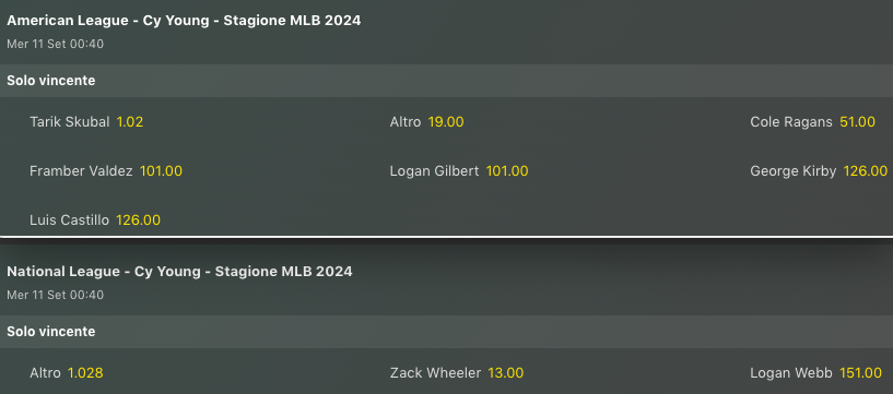 Ecco gli aggiornamenti delle quote antepost per la vittoria finale delle World Series che abbiamo già visto in parte prima, e i premi individuali con MVP, Cy Young e Rookie di American e National League, lavagne che sembrano tutte chiuse, e noi lo speriamo visto che per NL Cy Young abbiamo Chris Sale, grande favorito, che ha fatto implodere la quota Altro da @11 quando l’avevamo presa noi (con dentro Sale, una quota nettamente sbagliata) all’attuale quota @1.02, con Zach Wheeler, per tutta la stagione principale spauracchio, che si è definitivamente allontanato.