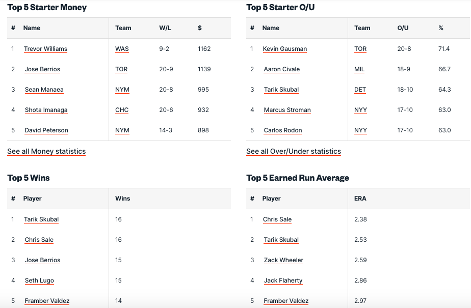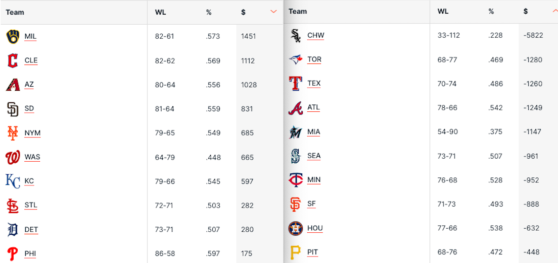 Sono sempre i Milwaukee Brewers la miglior squadra su cui puntare con +14.51 unità di profitto stagionale, mentre dietro Cleveland supera Arizona. Continuano a salire NY Mets e San Diego, calano i Washington Nationals che finora erano state una delle sorprese, almeno a rendimento in moneyline, così come i Kansas City Royals.