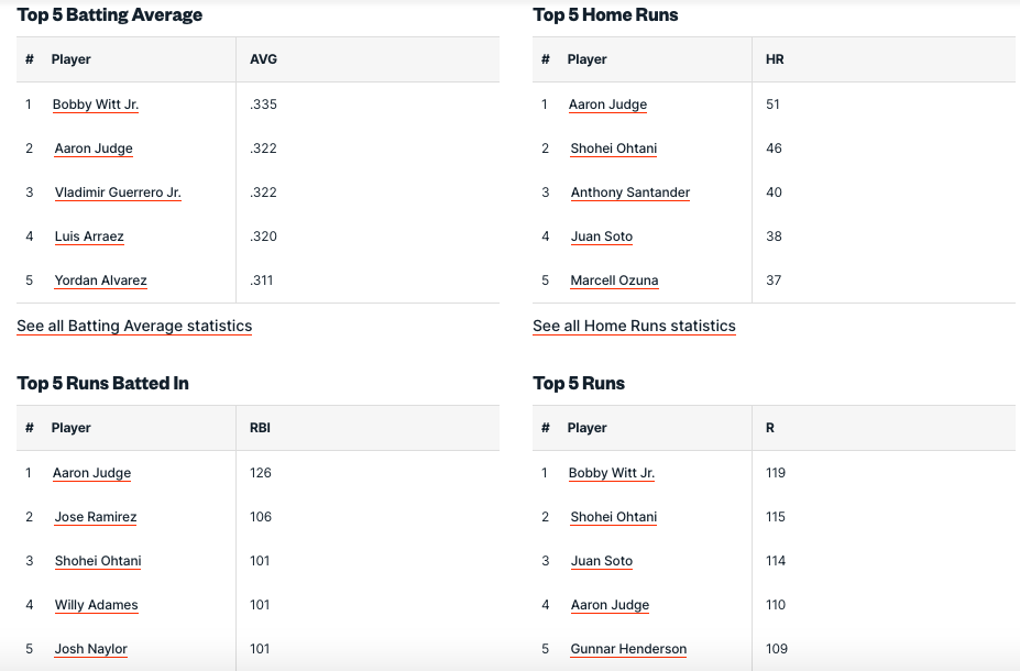Vediamo anche le top-5 delle principali statistiche di pitcher e giocatori d’attacco.
