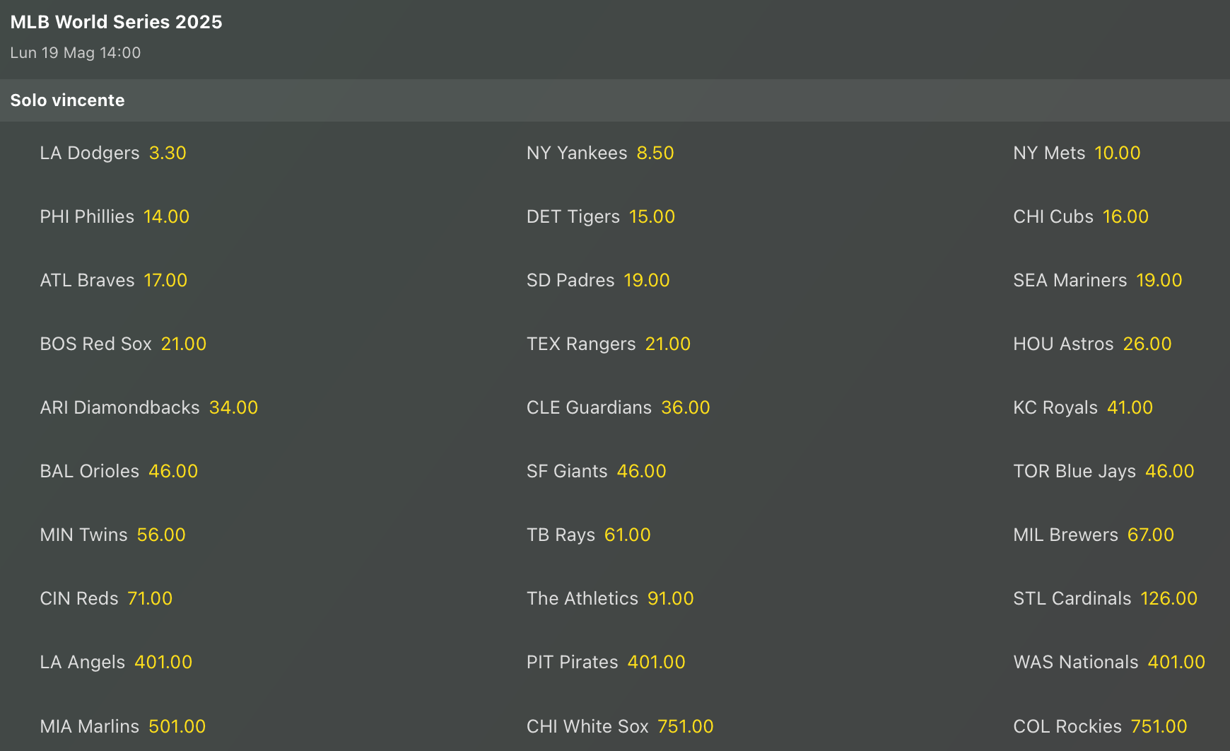 Andiamo a vedere le quote antepost per la vittoria finale delle World Series di Baseball aggiornate al 14 maggio 2025.