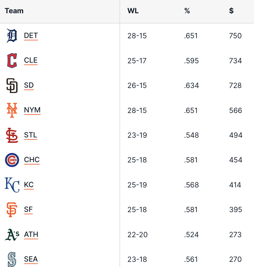 I Detroit Tigers si prendono il primato come miglior squadra su cui puntare, grazie ad un record di 28-15 che vale un +7.50 unità, superando i Cleveland Guardians a +7.34U e i San Diego Padres con +7.28U. Da segnalare che quasi tutto il profitto di Detroit arriva dalle partite in casa con +7.04U incassate nei match al Comerica Park, rispetto al misero +0.46U raccolto in trasferta. A sorpresa la miglior squadra come rendimento fuori casa è quella degli Athletics a +7.93U, ma che pagano -5.20U in “casa”, che per gli A’s non è proprio casa in realtà.