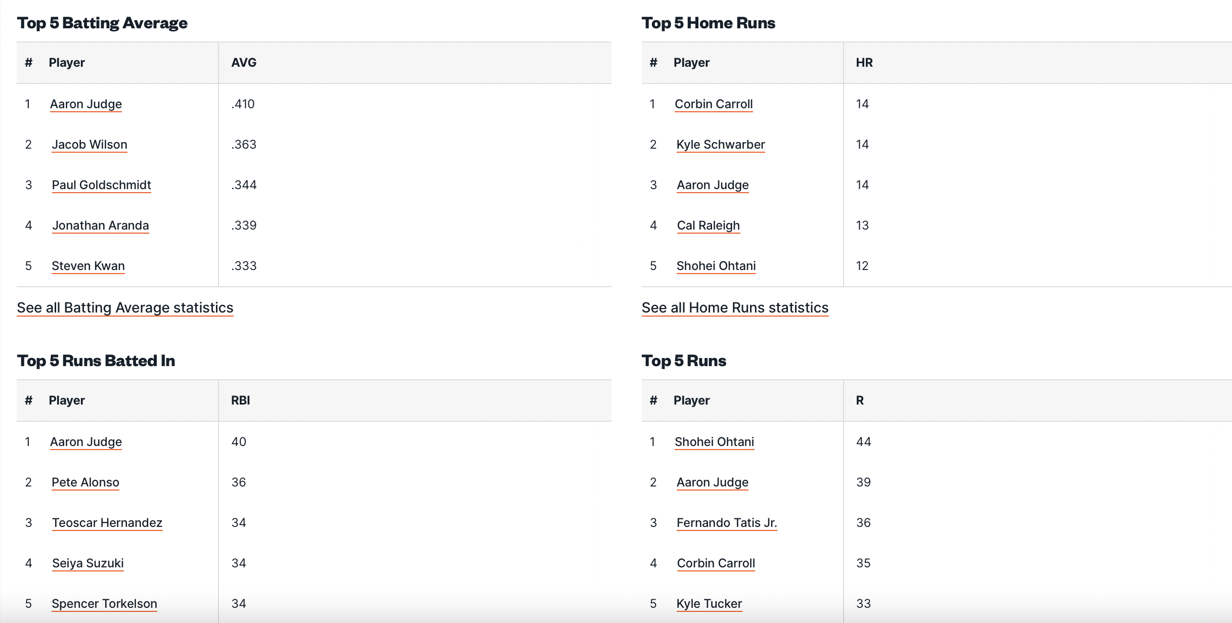 Chiudiamo con le top-5 delle principali statistiche per i battitori, e in tutte queste troviamo un impressionante Aaron Judge, che in 2 di queste è anche al comando (.410 di media battuta e 40 RBI), oltre a condividere il primo posto con Kyle Schwarber e Corbin Carroll negli homeruns con 14 fuori campo a testa, ed è secondo, dietro solo a Shohei Ohtani nelle runs segnate, 44 del giapponese di LAD contro i 39 della stella dei Bronx Bombers, con Fernando Tatis a completare questo podio con 36 runs personali.