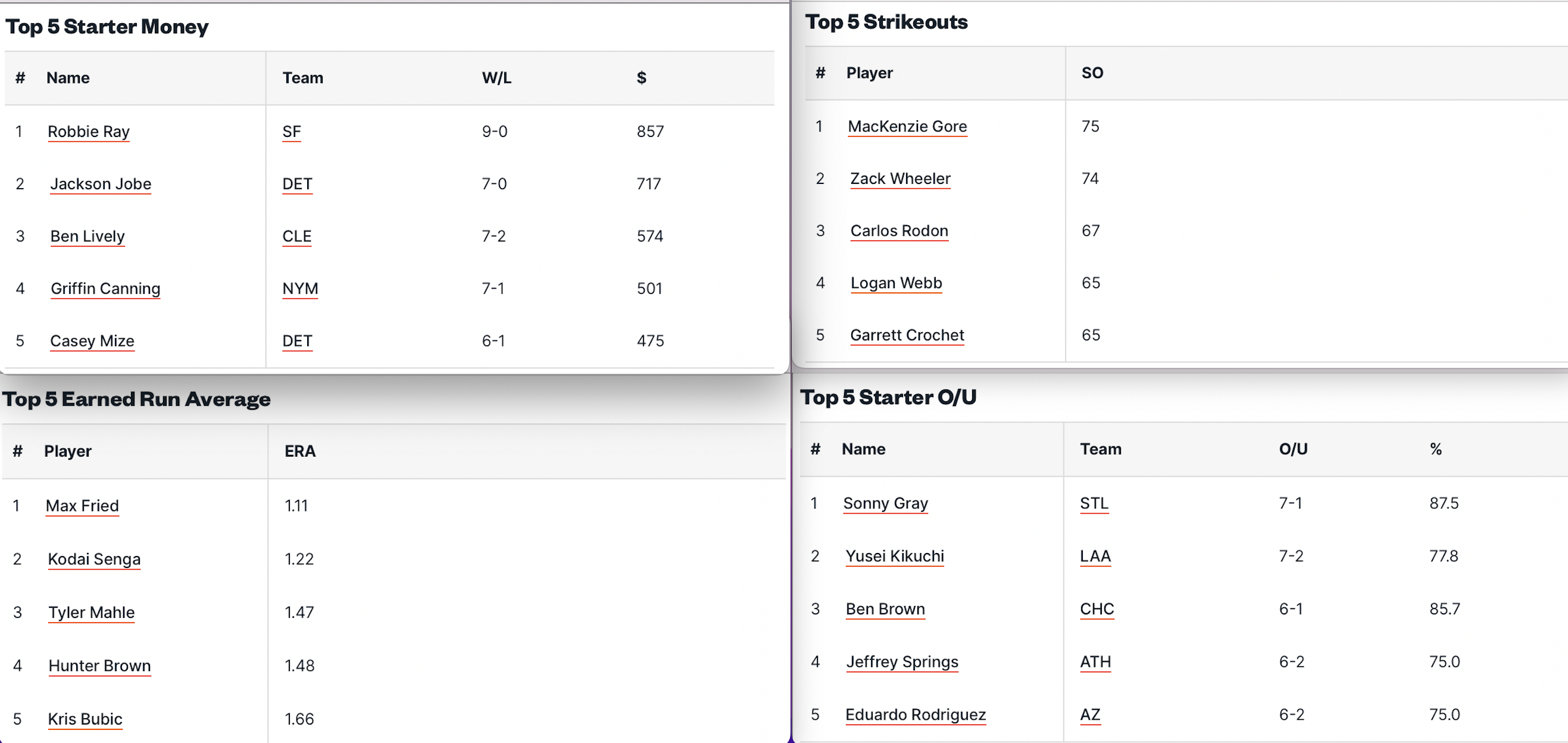 Sempre parlando di lanciatori, Yamamoto in una sola settimana passa dal 1° posto ad uscire dalla top-5, anche se mantiene un solido 1.80 ERA. Il migliore è Max Fried che sta tenendo un 1.11 ERA nella sua nuova avventura con i Knicks, tenendo alle spalle Kodai Senga a 1.22 ERA, rivale dei Mets, poi completa il podio Tyler Mahle con 1.47 ERA. Al momento il pitcher che ha messo insieme più strikeout è un nome inatteso, MacKenzie Gore a 75K con Washington, meglio anche di Zack Wheeler a 74K, poi c’è uno stacco con Carlos Rodon a 67 e Logan Webb con Garrett Crochet a 65. Infine il miglior pitcher per le partite ad alto punteggio, Sonny Gray che è O/U 7-1 in 8 start con i Cardinals finora. Al contrario il migliore da Under è O/U 1-7 e qui torniamo a parlare di Yoshinobu Yamamoto, nonostante sia il lanciatore di uno dei migliori attacchi della lega, quello dei Dodgers.