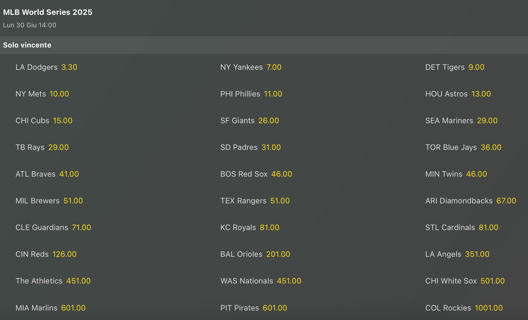 Quote Antepost: aggiornamenti MLB World Series 2025