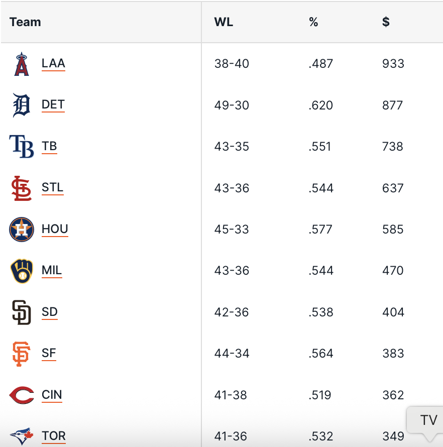 Sorpresa: gli LA Angels al momento sono la nuova miglior squadra su cui puntare a livello scommesse con +9.33 unità di profitto nonostante un record negativo di 38-40, meglio anche dei Detroit Tigers che qui vengono detronizzati nonostante un profit di +8.77 col suo 49-30 di record. Sul podio un altra sorpresa, i Tampa Bay Rays con +7.38, seguiti dai St.Louis Cardinals, anche loro inattesi in queste posizioni.
