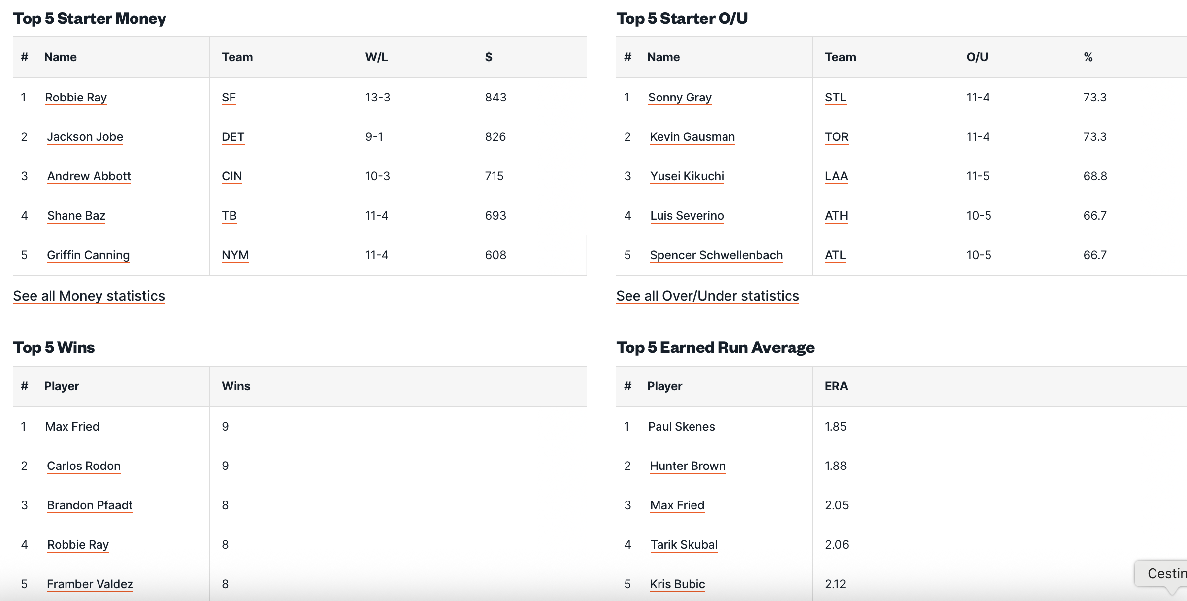 Sonny Gray è il miglior pitcher da Over (O/U 11-4), agganciato da Kevin Gausman e occhio anche agli alti punteggi quando vanno in campo Yusei Kikuchi (O/U 11-5), Luis Severino (O/U 10-5) e Spencer Schwellenbach (O/U 10-5). Paul Skenes è sempre il migliore come ERA (1.85), di poco avanti su Hunter Brown con 1.88 ERA, poi arriva Max Fried (2.05 ERA) che con 9 vittorie personali è al comando anche in questa classifica, assieme a Carlos Rodon. MacKenzie Gore ha perso il primato come migliori pitcher da strikeout (123 K) visto che ora al comando troviamo Garret Crochet con 125 K; più indietro Zach Wheeler (118 K) e Tarik Skubal (117 K).