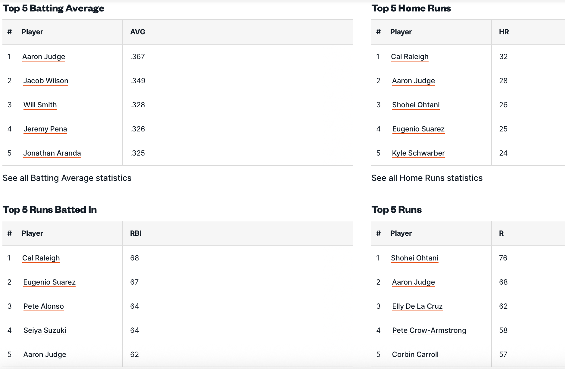 Passiamo ai battitori dove Aaron Judge rimane al comando come miglior media battuta, anche se in calo dopo i primi mesi sopra .400 (ora sta a .367), e il grande avversario è Shohei Ohtani che troviamo al comando nelle statistiche di runs, proprio su Judge, C’è un altro nome che sta salendo nelle attenzioni, Cal Raleigh, migliore della lega come home runs (32) e RBI (68) e caldissimo in questo periodo nella lineup di Seattle. Judge è 2° anche nella classifica di HR ed è l’unico giocatore nella top-5 di tutte le principali statistiche offensive.