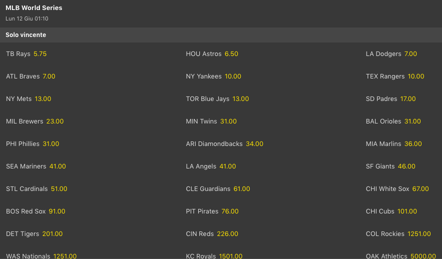 Scende di un pò la quota antepost per la vittoria finale delle World Series 2023 dei Tampa Bay Rays @5.75 che staccano gli Houston Astros @6.50 che salgono un pò. Stabili i LA Dodgers @7 che agganciano gli Atlanta Braves @7 in calo come i NY Yankees @10 che vengono raggiunti dai rampanti Texas Rangers @10.
