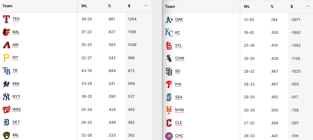 Tra le singole squadre i Texas Rangers (+12.64 unità) si prendono anche il primato come miglior squadra su cui scommettere, superando i Baltimore Orioles (+11.98) poi arrivano gli Arizona Diamondbacks (+10.46). Queste sono le uniche squadre in doppia cifra di unità vinte, ma sono vicini anche i Pittsburgh Pirates (9.86) poi arrivano i Tampa Bay Rays (+8.73).