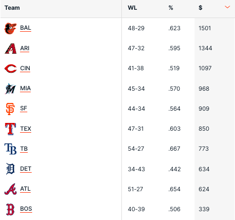 Iniziamo come dai rendimenti nelle scommesse delle singole squadre e praticamente non cambia nulla nelle prime 4 posizioni delle migliori squadre del betting, con sempre i Baltimore Orioles (+15.01 unità) che incrementano rispetto alla settimana scorsa, come Arizona Diamondbacks e Cincinnati Reds, mentre rimangono stabili i Miami Marlins. Il primo cambiamento lo abbiamo al 5° posto con i San Francisco Giants che superano i Texas Rangers, per una squadra che rimane un pò sottovalutata, e che invece sta andando meglio del previsto e ha vinto la bellezza di 12 delle ultime 14 partite!