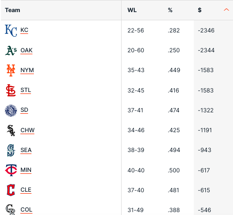 Non ci sono molti cambiamenti nemmeno nelle peggiori squadre su cui puntare, con Kansas City Royals (-23,46) che rimangono in fondo a questa classifica, seguiti a stretto giro dagli Oakland Athletics, poi si salta ai NY Mets che hanno peggiorato il rendimento dei St.Louis Cardinals.