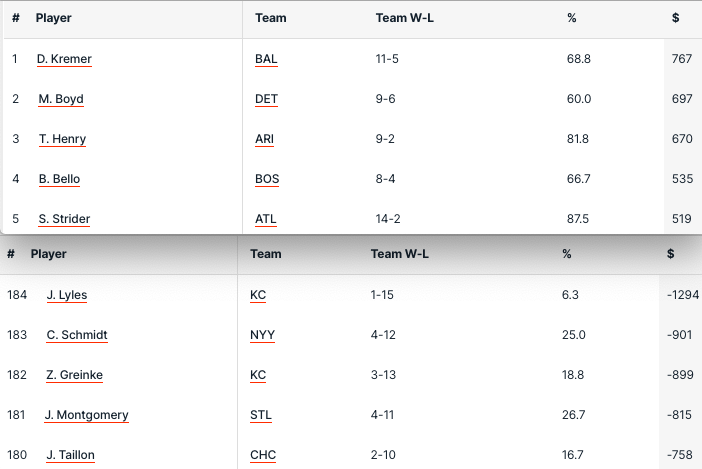 Vediamo anche i singoli pitcher è c’è sempre Dean Kremer (11-5, +7.67 unità) migliore di tutti e vincente anche in settimana mentre Matthew Boyd supera Tommy Henry. In forte crescita anche Brayan Bello e Steven Strider che arriva da una prova dominante che lo conferma miglior pitcher della lega come strikeout (ieri 10 K contro Minnesota che rimane sempre una delle lineup che concede più strikeout).