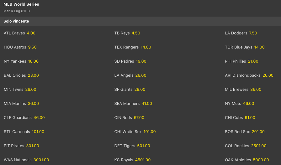 Cala ancora la quota degli Atlanta Braves che rispetto alla settimana scorsa passano da 4.40 a @4.00 mentre i Tampa Bay Rays rimangono stabili @4.50 come primi inseguitori per le MLB World Series 2023. Più indietro gli LA Dodgers che però scendono un pò in quota rispetto alla settimana scorsa (da 8 a @7.50).