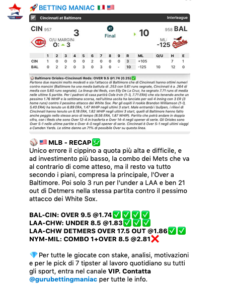Intanto nelle nostre scommesse la settimana inizia bene con la cassa nella giocata principale, l’Over a Baltimore sfruttando il buon momento dell’attacco dei Reds e i numeri degli Orioles, due lineup ottime specialmente contro lanciatori mancini, e ieri al via c’erano due pitcher mancini molto modesti (oltre ai bullpen che stanno lavorando male). Incassiamo anche 2 consigli secondari su 3, sbagliando solo il cippino minore a quota alta, la combo sui deludenti Mets che perdono, in una partita da poche runs, proprio il contrario di quanto pensassimo.