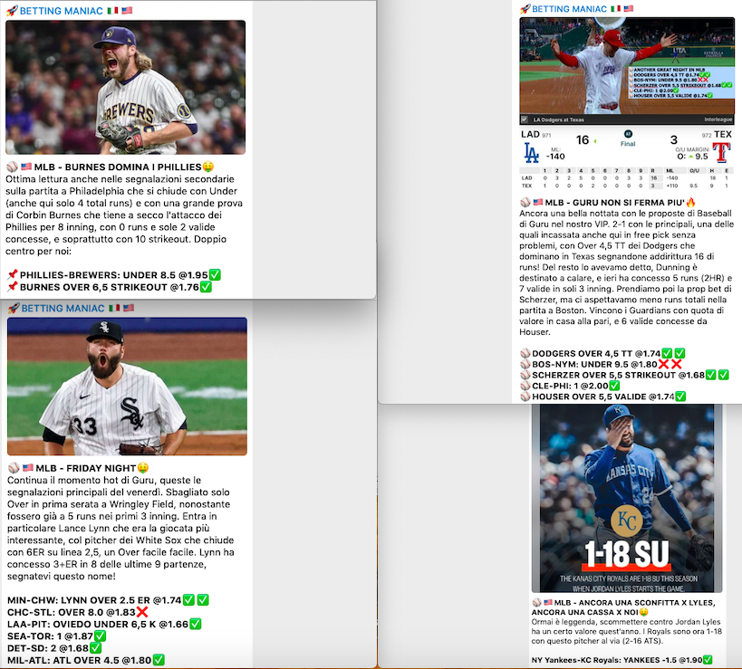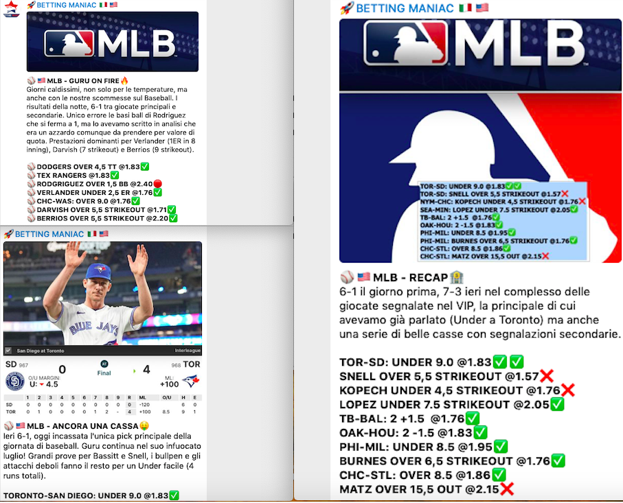 Iniziamo dai nostri rendimenti nelle scommesse di Baseball Americano MLB che stanno andando molto bene a luglio, e non è un caso che in queste settimane si registrino i risultati migliori. Il momento più profittevole per scommettere sulla MLB è iniziato. Tra luglio ed agosto le % di vincite salgono vertiginosamente perché i nostri tipster hanno potuto incamerare un buon numero di dati statistici che diventano affidabili in questi mesi. Ecco una serie di risultati incassati nell’ultima settimana di regular season e di pick che trovate ogni giorno nel nostro canale VIP BETTING MANIAC su Telegram.