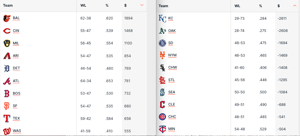 Torniamo a vedere anche le classifiche di rendimento con i Baltimore Orioles (62-38, +18,94 unità) che si prendono il primato di miglior squadra su cui scommettere, superando i Cincinnati Reds e i Milwaukee Brewers che si stanno sfidano in un testa a testa quasi alla pari anche per la vittoria divisionale di NL Central. Scendono al 4° posto gli Arizona Diamondbacks, tallonati dai sorprendenti Detroit Tigers positivi, almeno nelle scommesse. Non cambia invece la peggior squadra nei rendimenti delle scommesse, sempre i Kansas City Royals che con record di 29-73 sono costati -26,11 unità agli scommettitori, tallonati dall’altra grande pessima squadra, gli Oakland Athletics mentre in 3° posizione la grande delusione, i San Diego Padres.