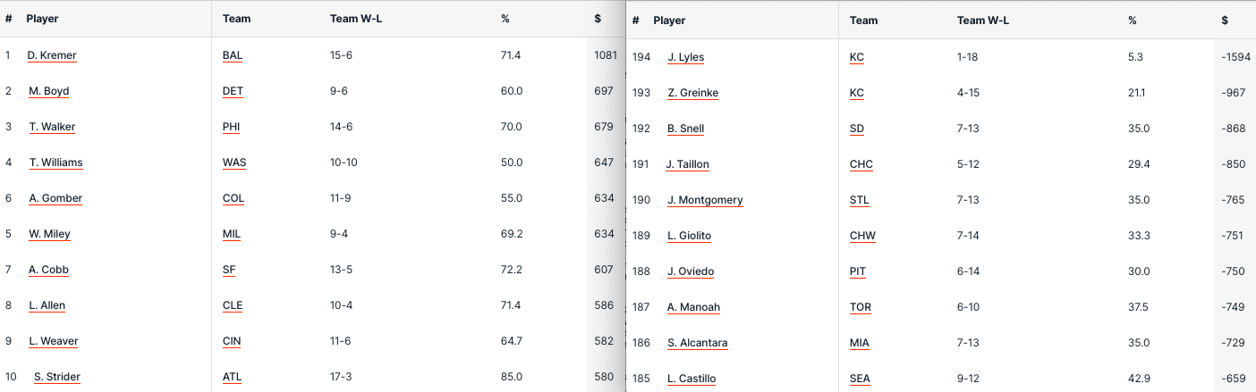 Singoli pitcher, il migliore come rendimento è Dean Kremer che ha portato gli Orioles ad un record di 15-6 per un +10,81 unità di profitto, unico in doppia cifra e che stacca nettamente Matthew Boyd e Tajuan Walker. Il peggior pitcher, neanche da dire, è Jordan Lyles (1-18, -15,94 unità), arrivato ad un record di 1-8 con KC (2-16 ATS anche in runline). Come avete visto anche sopra, stiamo giocando contro Lyles con regolarità, e questo ci ha portato tanti bei soldini in cassa. Al 2° posto in questa classifica un altro pitcher dei Royals, Zach Greinke, poi abbiamo un altro Padres che sta deludendo, in sintonia e in linea con tutta la squadra, Blake Snell.