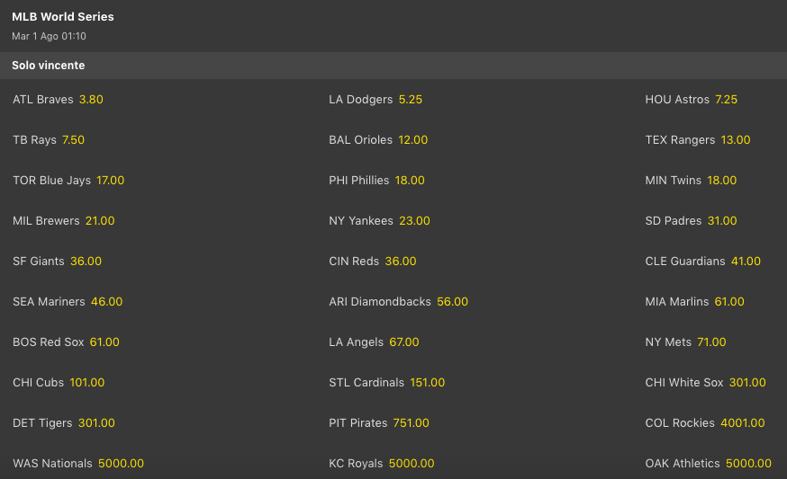 Cambia poco in testa alle lavagne delle quote antepost per la vittoria finale delle World Series 2023, con gli Atlanta Braves @3.25 sempre davanti ai LA Dodgers @5.25, poi ritroviamo gli Houston Astros @7.25 che superano i Tampa Bay Rays @7.50, così come i Baltimore Orioles @12 si mettono alle spalle i Texas Rangers @13.