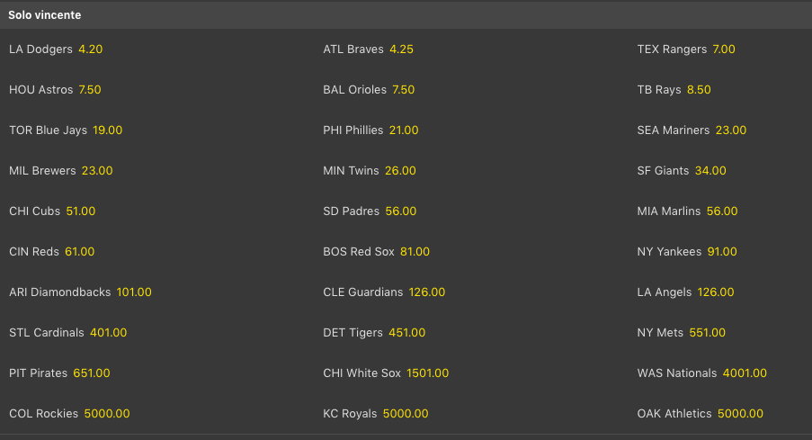 Se nel power ranking gli Atlanta Braves mantengono il primato, nelle lavagne delle quote antepost di Bet365 c’è una novità, rappresentata dagli LA Dodgers che superano proprio i Braves come favoriti per la vittoria finale delle World Series. Cala ancora un pò la quota dei Texas Rangers @7.00 che però sembrano essersi attestati come terza forza, staccata da LAD ed Atlanta. Molto vicini ci sono anche Houston Astros e Baltimore Orioles entrambe @7.50. Continuano a perdere terreno i Tampa Bay Rays @8.50 poi c’è un salto in doppia cifra fino ai Toronto Blue Jays @19.00.