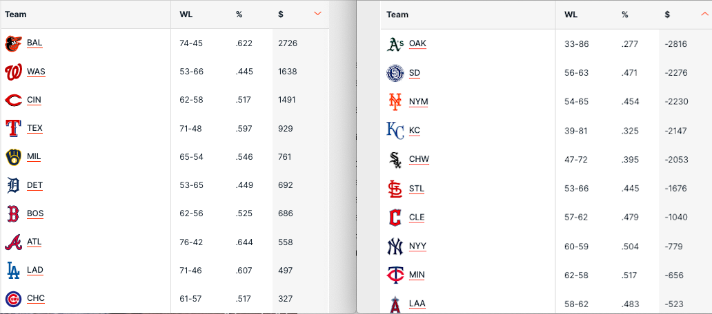 I Baltimore Orioles mantengono il miglior rendimento nelle scommesse con un record di 74-45 che vale un +27.26 unità, staccando nettamente i Washington Nationals che sono 2° ma con +16,38 unità. In calo i Cincinnati Reds che scendono al 3° posto anche nelle classifiche di rendimento delle scommesse.
