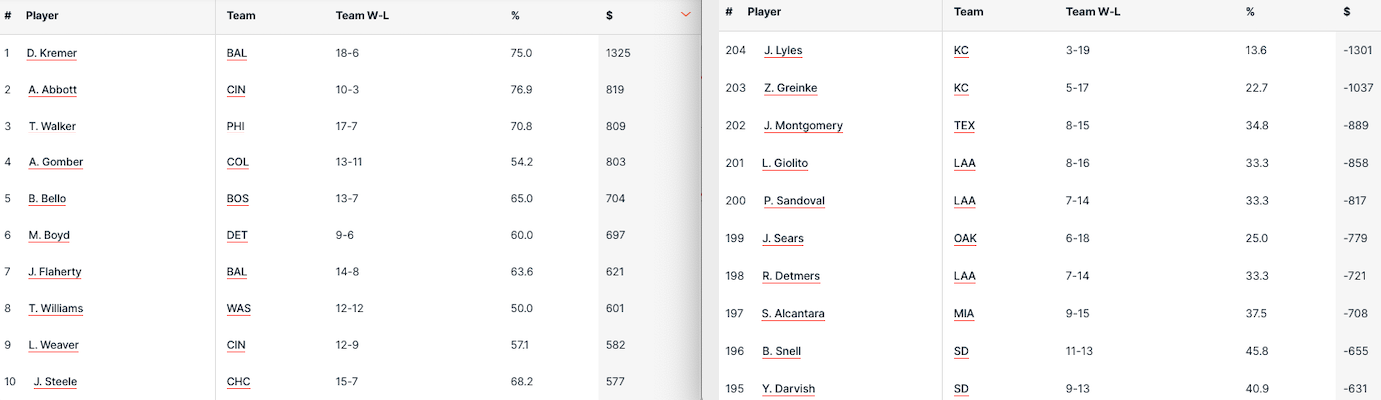 Tra i singoli pitcher il miglior rendimento nelle scommesse è sempre quello di Dean Kremer che ha portato Baltimore ad un record di 18-6, facendo incassare +13.25 unità e staccando nettamente Andrew Abbott in 2° posizione con +8.19. Battuta d’arreso per Tajuan Walker che scende al 3° posto.