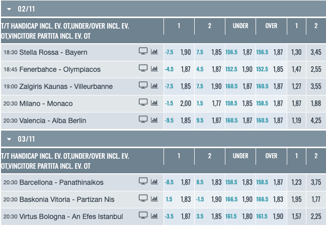 Più problemi per l’Efes che al momento è al 12° posto con un record di 2-3. Di recente i turchi hanno perso anche in casa in campionato, 76-95 contro il Galatasaray, oltre al 57-75 nell’ultimo turno di Eurolega sul campo del Olympiakos. L’Efes ha però vinto il doppio confronto dello scorso anno con le V-Nere, 85-80 a Bologna e 86-67 in casa. Vediamo la comparazione delle migliori quote sul mercato italiano per questo match di Euroleague.