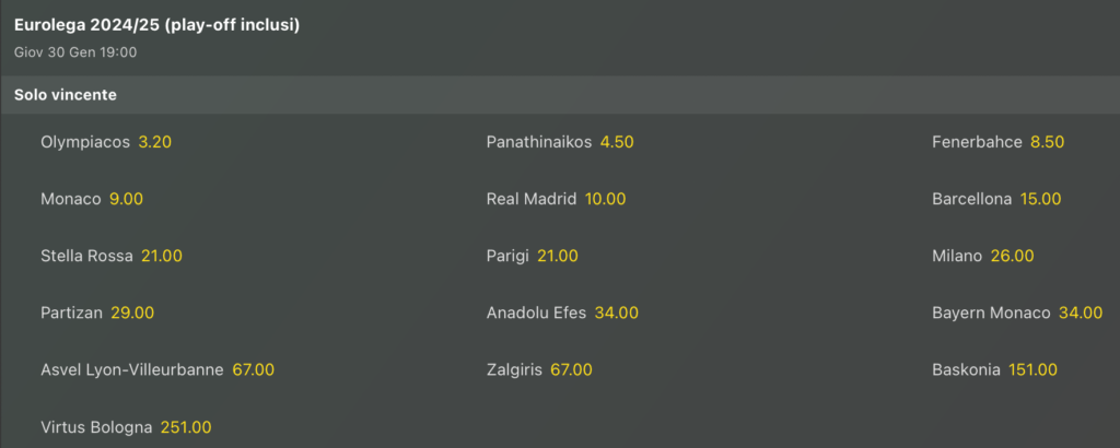 Vediamo gli aggiornamenti delle lavagne per le quote antepost sulla vittoria finale di Euroleague 2024-2025.
