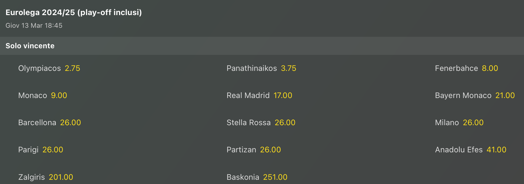 Vediamo gli aggiornamenti delle lavagne per le quote antepost sulla vittoria finale di Euroleague 2024-2025 secondo Bet365.