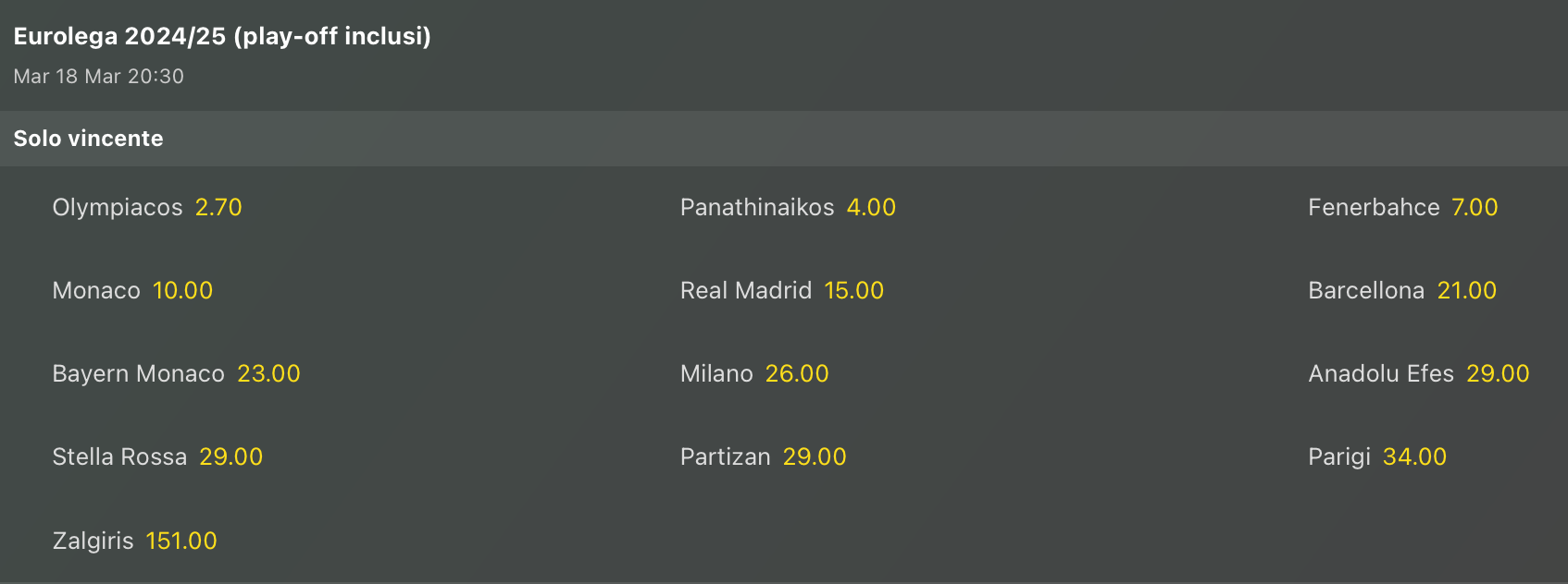 Quote Antepost: aggiornamento Euroleague 2024-2025