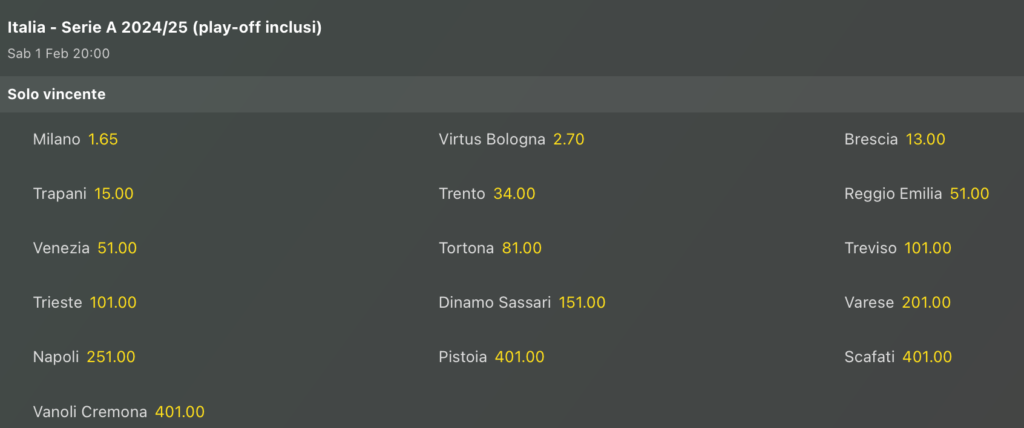 Andiamo a vedere le lavagne delle quote antepost per la vittoria dello scudetto di Basket italiano. Non cambia quasi niente al vertice, con l’Olimpia sempre favorita sulla Virtus, e Brescia staccatissima in tripla cifra, come Trapani che rimane al comando, ma rimane anche snobbata per la vittoria finale.