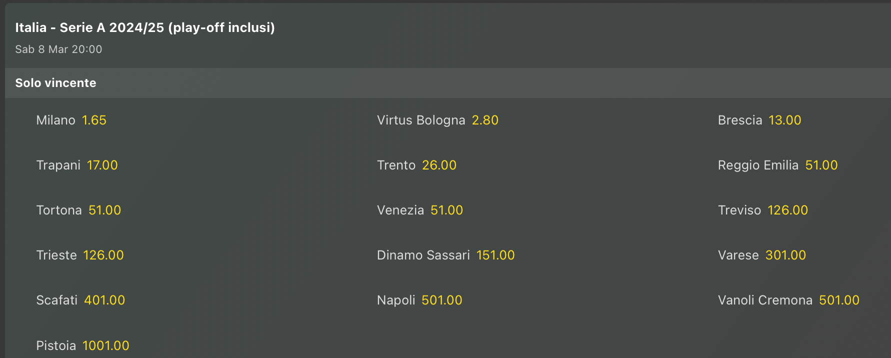 Quote antepost: gli aggiornamenti per lo scudetto di basket