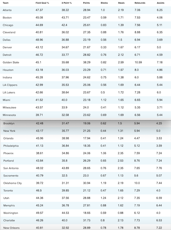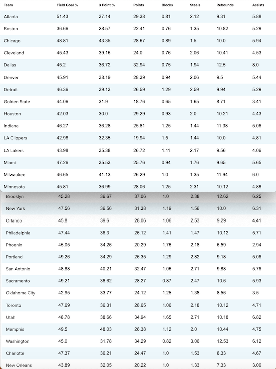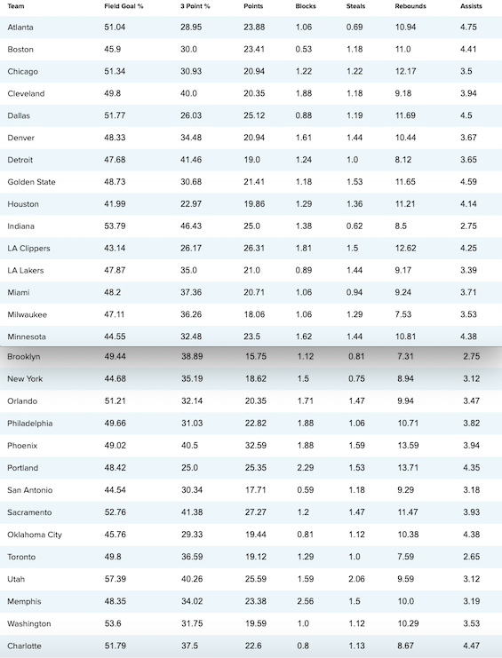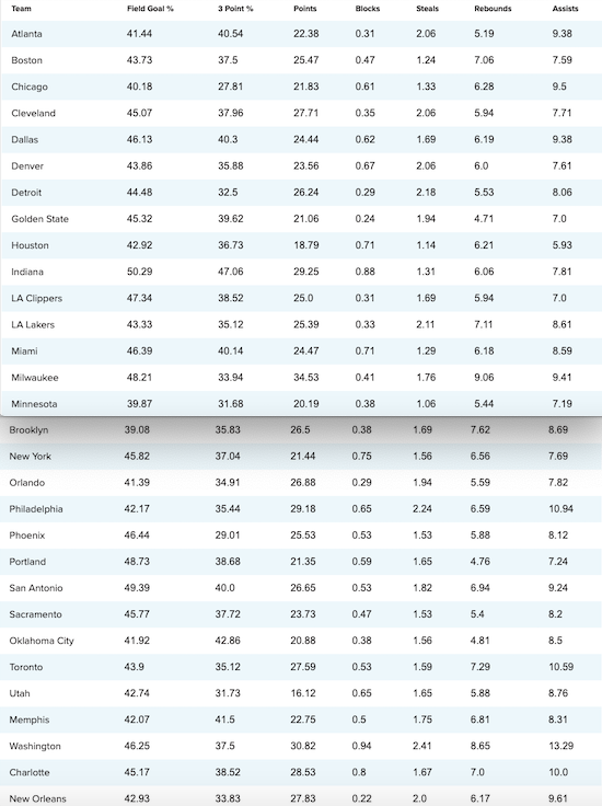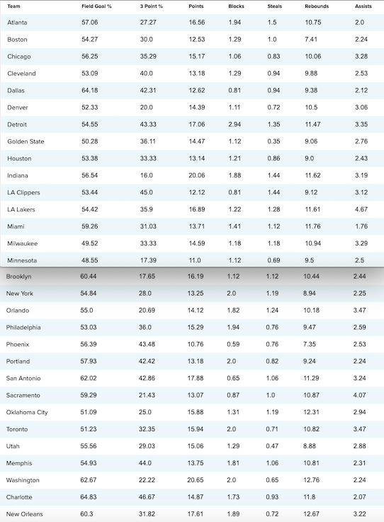 Gli LA Clippers sono i peggiori contro le Power Forward con 26.31 punti concessi di media ma anche 12,62 rimbalzi (qui solo Phoenix e Portland, sopra a 13, fanno peggio). La miglior difesa contro le PF è quella dei Brooklyn Nets che subiscono 15,75 punti di media da questo ruolo, e i Nets qui sono i migliori anche nei rimbalzi (7.31).