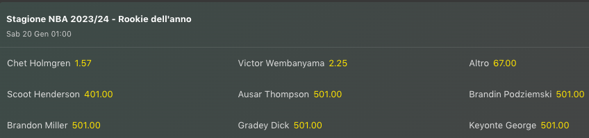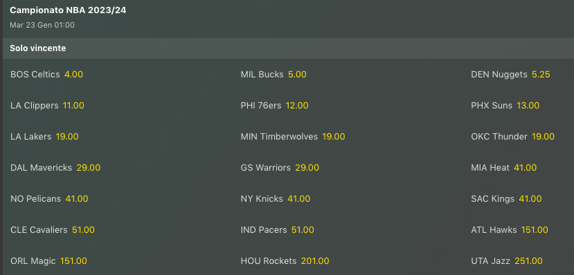 Lavagna quasi fotocopia per le quote antepost sulla vittoria finale dell’anello di Basket NBA 2023-24 rispetto alla settimana scorsa. Cambia un pò la quota dei Celtics che scendono da 4.50 all’attuale @4, allungando su Bucks e Nuggets che rimangono rispettivamente @5 e @5.25 volte la posta, poi si salta @11 con i Clippers e @12 con i 76ers.