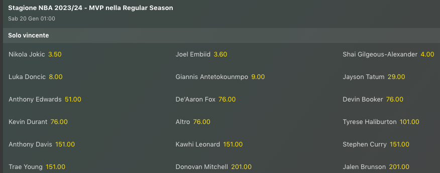 Quote Antepost: pochi cambi in lavagna. Embiid batte Jokic e si riavvicina per MVP