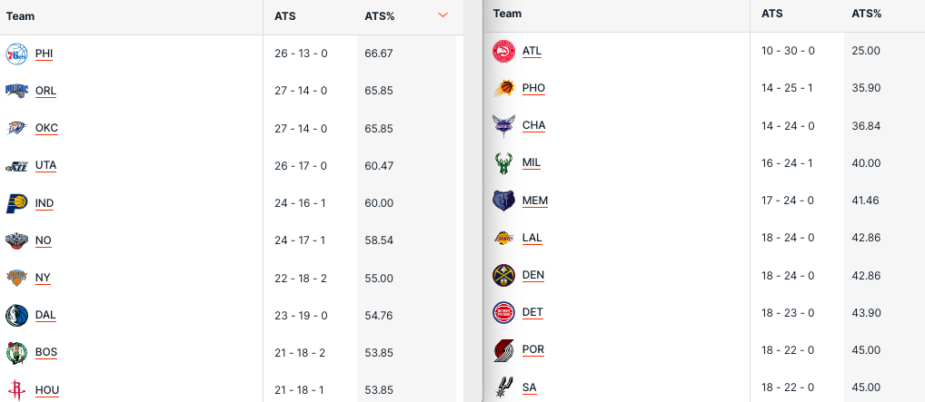 Nell’ultima settimana abbiamo assistito ad un insolita prevalenza di partite da Under uscite nel 60.8% dei match rispetto al 39.2% di Over. Andando più nel dettaglio troviamo i Philadelphia 76ers con 23-13 ATS (66.6%) come miglior squadra su cui puntare, davanti ad Orlando e a OKC. Al contrario gli Atlanta Hawks con 10-30 ATS (25%) si confermano come peggiori. Ecco la top e la flop 10 dei rendimenti ATS (le scommesse sugli handicap).