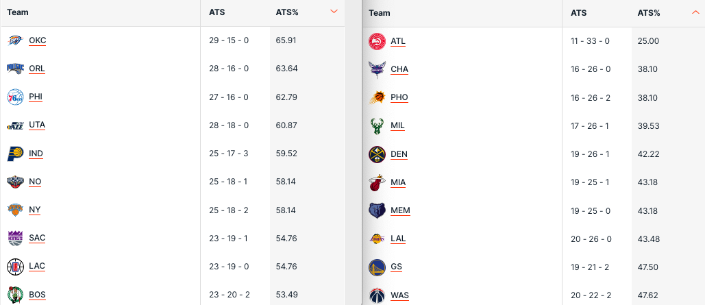 Vediamo anche gli aggiornamenti sulle migliori e peggiori squadre come rendimento nelle statistiche. Gli OKC Thunder tornano ad essere la miglior squadra su cui scommettere con 29-15 ATS (65,9% di linee coperte) mentre i peggiori si confermano gli Atlanta Hawks con un tremendo 11-33 ATS (25%), peggio (e non di poco) anche dei Charlotte Hornets (38.1%) poi arrivano 3 big che stanno deludendo nelle scommesse: Phoenix, Milwaukee e Denver.