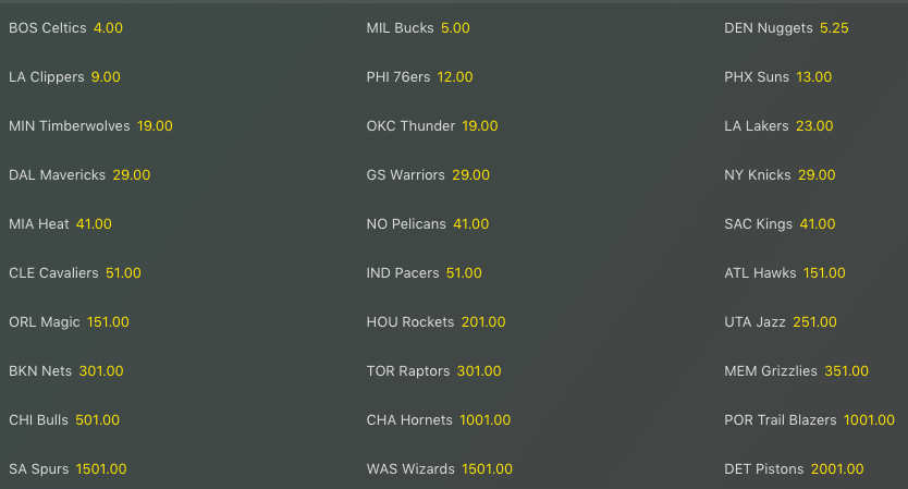 Poche variazioni rispetto alla scorsa settimana nelle quote antepost per la vittoria finale dell’anello NBA 2023-24, col solito trio al comando formato da Boston Celtics, Milwaukee Bucks e Denver Nuggets, ma attenzione che scende la quota degli LA Clippers @9 che continuano a convincere e in una settimana abbassano la quota da 11 in singola cifra.