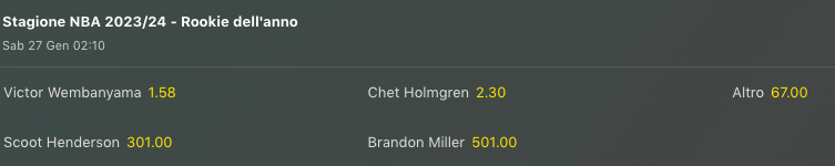 Per il Rookie dell’anno si ribaltano perfettamente i primi due. La settimana scorsa avevamo Chet Holmgren al comando a 1.57 di quota, con Victor Wembanyama staccato a 2.25. Questa settimana i due si sono anche incrociati e i Thunder di Holmgren hanno pure vinto, ma questa settimana troviamo Holmgren al secondo posto nelle lavagne con quota @2.25 mentre il francese è tornato a dominare @1.58.