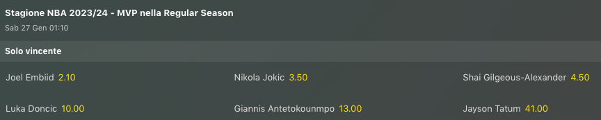 La prestazione da 70 punti, e una incredibile striscia di partite da 30+ punti segnati, torna a proiettare Joel Embiid @2.10 come favorito per MVP, scavalcando Nikola Jokic. Sempre stabile Shai Gilgeous Alexander come terzo incomodo, attenzione a Luka Doncic @10 che prova a ricucire sui primi, e si lascia alle spalle anche Giannis Antetokounmpo.