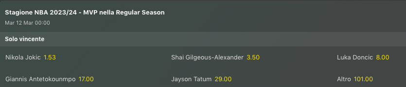 Nella vittoria dei Mavericks sui Pistons è arrivata un altra grande prova di Luka Doncic (39 punti + 10 assist e 10 rimbalzi) che è diventato il primo nella storia NBA a segnare 5 triple doppie di fila con almeno 35 punti a referto, riaprendo anche la corsa per MPV come vediamo anche nell’immagine qui sotto delle quote antepost. I Bulls dopo 3 vittorie si sono fermati a LAC sabato. I Mavs hanno vinto il precedente di novembre 114-105 con soli 18 punti, 10 assist e 7 rimbalzi di Doncic, e con Grant Williams miglior marcatore a sorpresa con 25 punti. Per i Bulls non bastarono i 21+20 rimbalzi di Nikola Vucevic che ha chiuso in doppia doppia (22+11) anche l’ultima contro LAC (assieme a 24 punti, 10 assist e 8 rimbalzi di DeMar DeRozan).
