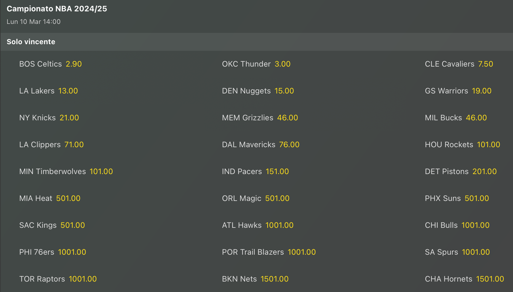 NBA LUNEDI 10 MARZO